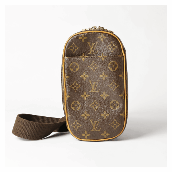 ボディバッグタイプのお品物で、定番のモノグラム柄、ポシェット ガンジュというお品物です。シンプルなデザインと、1日お出かけするのにちょうど良いサイズ感で、シーンを選ばずに活躍しそうな素敵なお品物ですね。