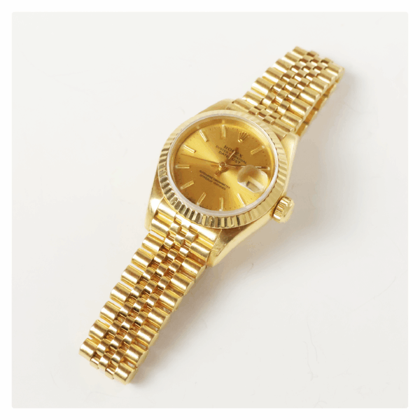 オイスター パーペチュアルのデイトジャストです。18金(K18)が使用されており、ベルト部分のジュビリーブレスレットの華のある雰囲気も相まって、非常にドレッシーなお品物ですね。大切にされていたことが伝わってくる一本でした。しっかりと精一杯のお見積りをさせていただきました。