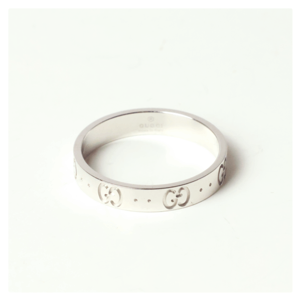 18金ホワイトゴールド(K18WG)で制作されたアイコン リングです。グッチのGGマークがあしらわれている、定番デザインのお品物ですね。お品物は18金素材という価値に加えて、ブランドジュエリーとしての市場価値も考慮に含め、しっかりとお見積りをご提案いたしました。