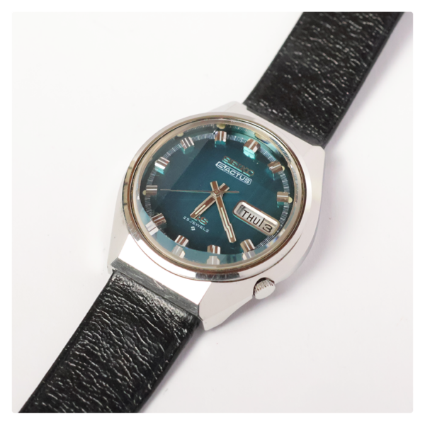 セイコー 5アクタスという腕時計をお持ちになっていただきました。1970年代前半に製造されたアンティークといえる自動巻き式の1本で、文字盤前面の3面カットガラスや、カレンダーの曜日表記が英字と漢字(!)で切り替え可能、といったところにユニークさを感じます。エメラルドグリーン色の文字盤色も美しいですね。ケースや3面カットガラスに使用に伴う若干の擦れ傷はございましたが、問題なく動作可能な状態でお持ちくださいました。
