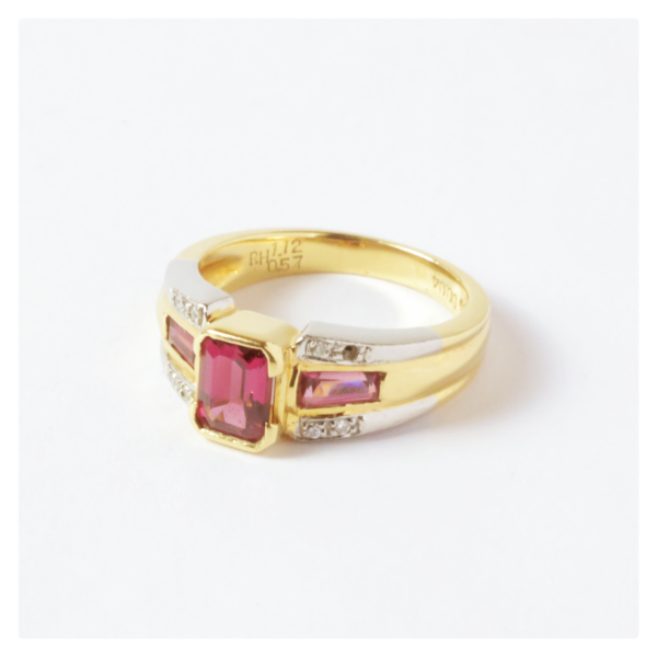 ルビーがあしらわれた、18金(K18)と一部プラチナ900(Pt900)で制作された指輪をお持ち込みいただき、しっかりと鑑定させていただきました。金とプラチナをうまく接合しており、凝った作りの華やかなお品物でした。メレダイヤモンドがひとつ欠落してしまっていましたが、ご説明のうえ精一杯のお見積りをご提案いたしました。