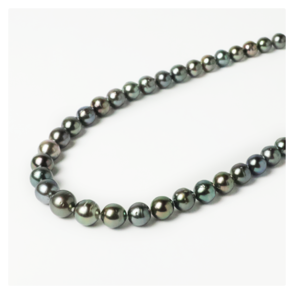 黒蝶真珠の一連ネックレスをお持ちになっていただき、鑑定させていただきました。鑑別書も一緒にお持ちになってくださいました。ひとつひとつが少しずつ個性のある形をしており、それぞれの色差も感じられます。おそらく制作時には、それぞれの色差が活きるように順番を考えながら作られたのでしょうか。楽しく拝見させていただき、精一杯のお見積りをご提案させていただきました。