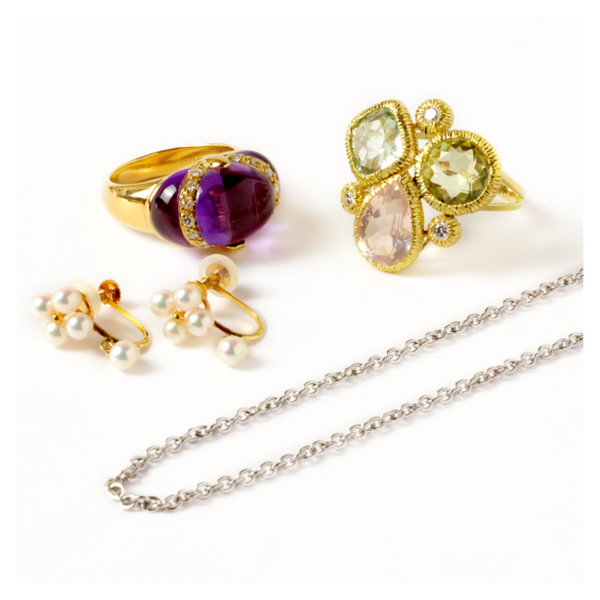 18金(K18)で制作されたジュエリー類をお持ち込みいただき、しっかりと鑑定させていただきました。濃い紫色が鮮やかなアメシスト、小ダイヤモンド、ファンシーカラーのクォーツ、パールといった様々な宝石類がデザインされており、私も楽しく拝見させていただきました。華やかな印象の素敵なお品物たちでした。